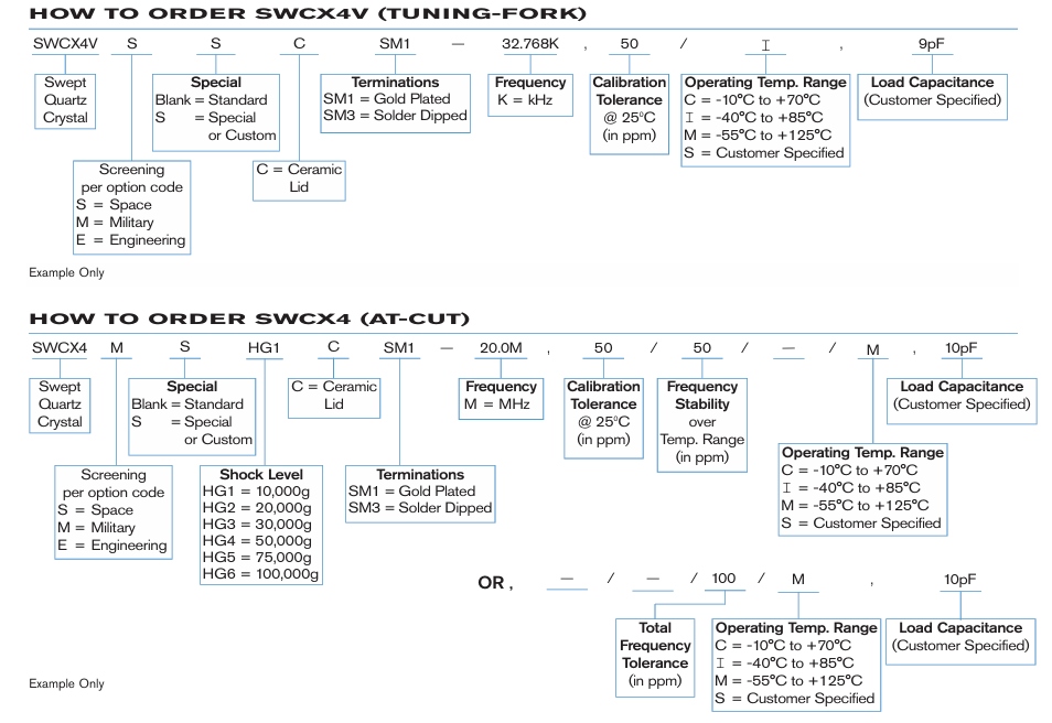 | Frequency-Temperature Stabiity Options (SWCX4 only) | ±50 ppm 2o±10 ppm,over -10℃ to +70*℃ ±50 ppm 2o±20 ppm,over -40℃ to +85*℃ ±50 ppm 2o±30 ppm,over -55°℃ to +125℃ | ||